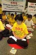 美联社图片:香港市区,星期日晚,2002年6月30日,法轮功修炼者在举行烛光守夜活动时打坐抗议中国大陆(江泽民)对其成员的。这场抗议是来港参加香港97回归纪念活动的国家主席江泽民和副总理钱其琛到达后举行的。法轮功成员抱怨说有90名以上来港参加抗议的法轮功成员被禁入境。
