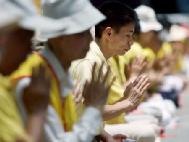 路透社图片(Bobby Yip):2002年6月30日,在香港回归5周年前夕,法轮功学员在警察设置的栅栏后面打坐,抗议江泽民镇压法轮功。一百多名法轮功学员加入了静坐抗议,至少有20名以上希望加入静坐抗议的法轮功学员被拒绝入境。