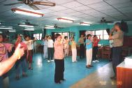 在新兴国小大礼堂,一群专注的新学员聚精会神的随着王永昆先生的讲解炼着功,因其讲解是如此生动,以至每位参与研习的学员均感同身受。王永昆先生也在教功时,提到师父在《转法轮》中指出炼功不长功的两个原因:“不知道高层次中的法就没有法修;没有向内去修,不修炼心性不长功。”以他个人走过的路,心性没有提高,身体就没法改善。大家也在[佛光普照,礼义圆明]的场中,继续这两天的研习,接着上场便是小弟子功法表演,看着台上小弟子们专注的炼功,台下的老师们目不转睛地看着,这美好的画面真是无法用文字描述。