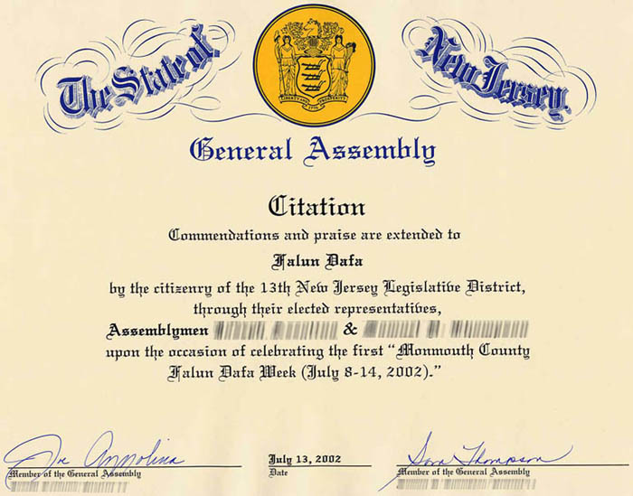 在庆祝首届曼茂斯郡“法轮大法周”(2002年7月8日至14日)之际,新泽西州第13选区的全体人民通过他们的当选代表,众议员约瑟夫-阿舟莱纳和众议员众议员萨谬尔-汤姆森, 对法轮大法予以嘉奖和赞扬。
