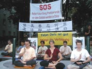 【明慧网2002年7月17日】在中国外交部长唐家璇访问奥地利期间,奥地利大法弟子在中国大使馆前呼吁停止在中国对法轮功的残酷镇压,并写了一封呼吁信给中国外长。中国大使馆的工作人员将大门紧闭,奥地利弟子将呼吁信投入使馆的信箱。同时其他的大法弟子在使馆前持续发正念。