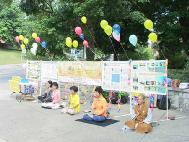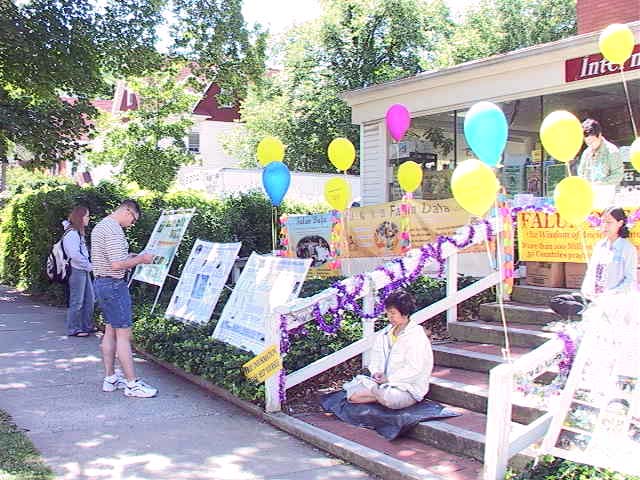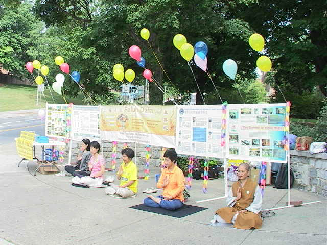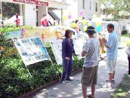 第四天的活动转移阵地,事前向学校申请的场地,被改在校区与市中心两条主要道路的交叉口,是人车流量密度最高的地方,比我们原先预期的地点要好得多,又是人算不如天算,一切都是师父的巧妙安排。这里来来往往的人潮,十之八九是年轻的学生,虽然时值暑假,返校参加夏季班课程的人数仍然很多,他们大多三五成群,一路喧哗;少数落单的,也显得行色匆匆,赴约似的。我们熟练搭起来的图片看板,以及缤纷飘扬的彩球,很快引起他们的注意。我们几个固定的学员,谁炼功,谁发资料,谁站在哪个位置,谁来轮流替位,搭配得默契十足,彷佛是交往多年的老友,又好像是经过多少次排演一般。事实上,几天前,我们其中几个人是完全不知道这人世间有个这样的你或我。工作当中或空档之时,大家不忘切磋互补,相互精进提高,诚如师父《神路难》一诗所言“悠悠万世缘 大法一线牵”,我们今生今世的相遇,岂是偶然?这稍纵即逝的因缘,岂容等闲错过?