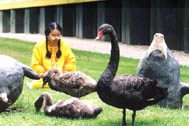 黑天鹅妈妈每天下午3点按时带领两只小天鹅来到我们的炼功点。当我们炼功时,它们趴在旁边,或穿行在我们中间,并不打扰我们。在最后两天,天鹅爸爸也来了。这一景观也引来很多游人。