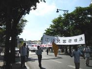大家看到我们的队伍经过都主动地来要介绍材料,有一位80岁的老年妇女,一位学员的邻居一家,一位从几百公里以外赶来的年轻人,加入了我们的队伍,表示对法轮功的支持。