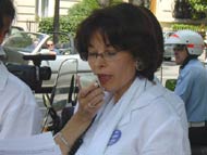 一位住在临街的住宅的女士出来观看游行队伍,她还记得去年我们的游行队伍过去的时候美妙动听的音乐。她在接受记者采访时,她说她要尽她的力量帮助法轮功,他看到这些身着白衣的女士手捧着在迫害中死难者的照片让她很感动。