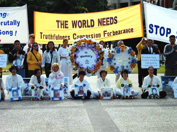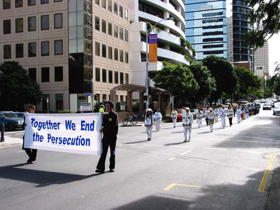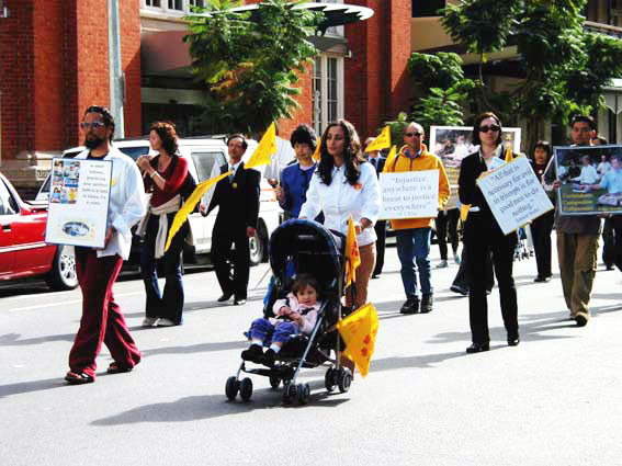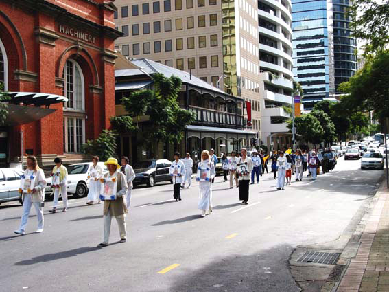 尔后,于下午1点钟,法轮功学员开始环绕市中心的封路大游行。最前面是巨大的花圈,而后一辆装饰着《转法轮》模型的卡车和“我们一起结束镇压”等横幅,女学员们身着白衣白裙,手持死难学员的照片,男学员身着黑色西装紧跟其后。 值得一提的是,在长期的与法轮功学员接触观察后,警方对法轮功学员有坚实的信赖,几次重要活动都批准我们的封路游行。第一次封路游行时,警方如临大敌,三步一岗,五步一哨,生怕有任何闪失。之后的游行,警察人数越来越少,这一次,几乎都找不到警察,只有在路口,看到一个警察在中间示意路人车辆止步。
