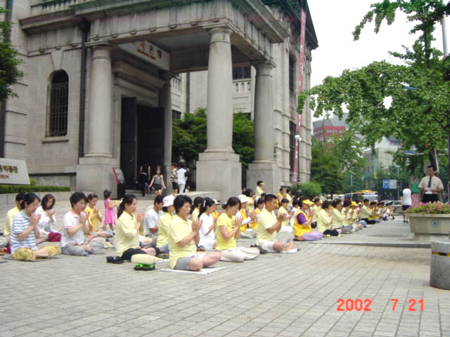 这一日,汉城地区的数十名韩国学员来到中国驻韩大使馆对面的韩国银行前面,进行了和平请愿和讲清真相活动。12点55分(北京时间11点55分)至1点10分开始了与世界各地的大法弟子同步发正念的活动,庄严神圣的正念之场和大法弟子的浩然正气震撼寰宇。他们又向人们展示了优美舒展的法轮功前四套功法。这里人潮如流、车水马龙,市民们望着“法轮大法是正法”、“法轮大法好”和“江泽民立即停止对法轮功的镇压”等大横幅,眼里闪现出敬佩的目光,并认真阅读学员发给的真相传单。