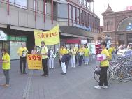 七月二十日上午,游行的队伍穿过了波恩市中心的步行街。在游行队伍默默地行进时,几千份传单发到了行人手中,从而使公众了解了法轮功,引起了人们对在中国受迫害的弟子们的关注。在昔日的首都,美丽的大学城,我们碰到的人大多对我们十分理解,很多人都知道法轮功:“噢,法轮功。”中午我们在市中心的Muenster广场集体发正念。