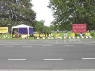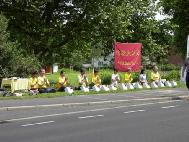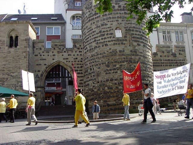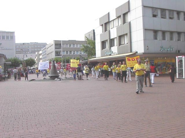 接着又开始了从市中心到Bad Godesberg的游行。这次在一位友好的警察的陪同下,我们游行穿过了购物中心──这里曾是波恩的外交官们的居住区。当看到被虐杀的年轻的大法弟子们的相片、横幅和展板时,人们脸上的表情是那么的严肃。