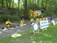 “让我们共同制止这场对法轮功的迫害”的中英文大字标语吸引着过往行人,很多人驻足观看并接受真相材料。在这庄严肃穆的气氛中,我们用纯净的正念在另外空间清除自己的业力与执著,以及一切迫害大法的邪恶因素。