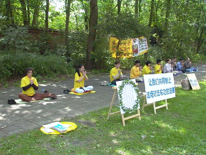 我们在使馆的对面挂起“法轮大法”的旗帜和“SOS”的横幅,安放好写着被迫害致死的法轮功学员名字的两个花圈。在路边的草坪上摆放着九张“正法之路”图片展板,这些图片展现着法轮功学员在这三年中被残酷迫害的事实和他们为维护人间正义而向世人讲清真相的伟大壮举。