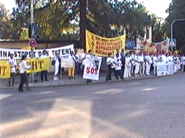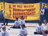 | 真善忍德语横幅在游行队伍中 | 国际人权组织的负责人也在游行队伍中走了两个小时 | 游行终点站,法轮功学员们在中国领事馆对面发正念 |