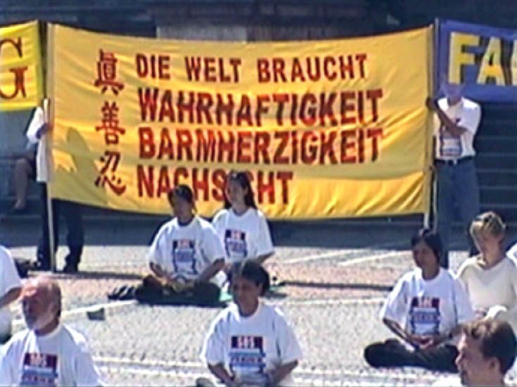 | 世界需要真善忍 | 慕尼黑法轮功学员在市中心大广场上 | 身材魁梧的德国警官已经修炼法轮功四年了,他热心地拿着话筒协助现场的反迫害演讲 |
