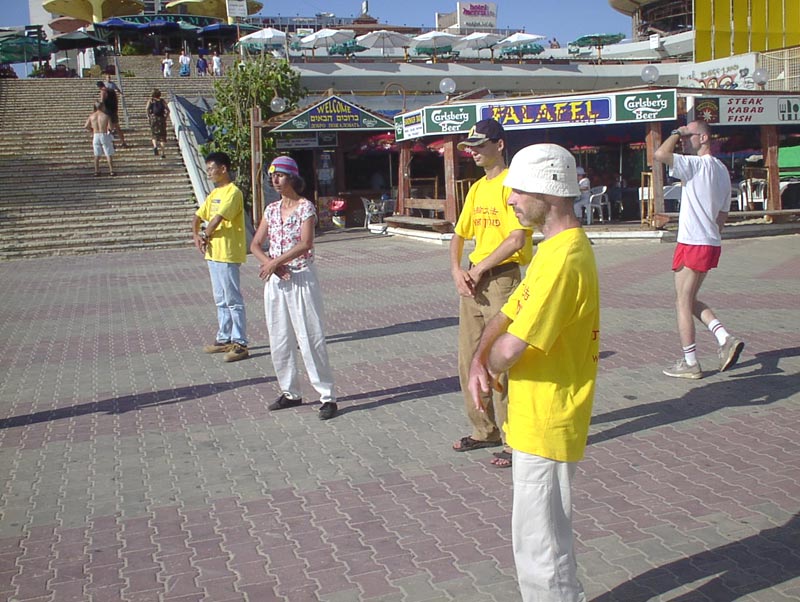 2002年7月20日,法轮功在中国被江泽民集团残酷迫害三周年,以色列特拉维夫法轮功学员走上街头发传单讲真相。学员们步行到海滨,炼功讲真相。最后,学员们来到特拉维夫中领馆前,举行烛光守夜。