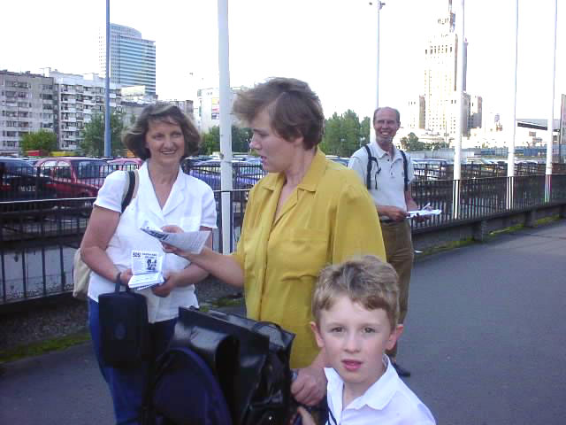 一下飞机,我们即登上开往市中心的公共汽车,来到了热闹的文化宫广场。我们一边朝火车站的方向走,一边向人们发送大法资料。由于我们不会讲波兰语,而很多波兰人又不会讲英语,所以我们只能以微笑、手势和简单的语言告诉他们法轮大法好。