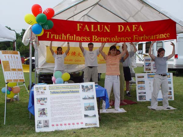 星期六下午,联邦众议员吉尔曼先生(Gilman)忽然来到我们大法展位。 他和他的夫人仔细地询问我们法轮功功法的特点,并表示有兴趣尝试。我们于是向他赠送了教功录像带和《法轮功》。吉尔曼先生高兴地说他会在家学炼。
