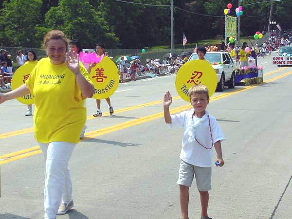 节日的气温高达92度,骄阳似火,但是前来观看游行的人们仍然很多,站满了近两英里的街道两旁。这是我们第二次参加他们的国庆节游行,加上圣路易法轮功学员经常抽时间和当地学员一起办大法介绍班,接受媒体采访,到大学教功等等,所以人们已经对我们有一定的了解。很多人远远地就向我们招手、鼓掌,还有人索要资料。我们准备的印有“法轮大法”的气球更是大受欢迎。其中有一群中学生,很远就注视着一位学员手中拿着的大圆板上用中英文写的“忍”字。其中有一男生指着中文的“忍”字说:“忍。太好了!只不过我不知道怎样用中文写这个字。”