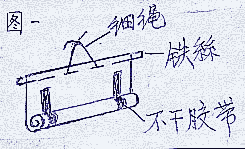 【明慧网2002年8月1日】条幅上端横穿一根铁丝(直径2.4毫米以上),下端两边各横穿一根2寸长铁钉,起重垂作用,然后将条幅从下端向上卷成卷,用1公分宽的不干胶条,一端把卷粘牢,另一端粘在铁丝的下面,粘面长约2.5公分(如图一),凭借卷身自重慢慢将不干胶拉开,从而使条幅打开。(粘合面长2.5公分为参考数,粘面越长,拉开条幅所需时间越长。)