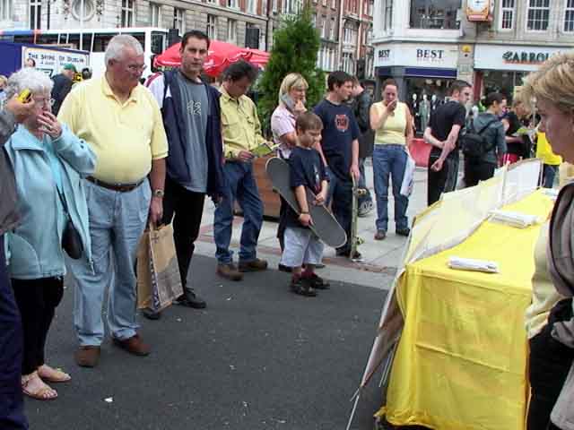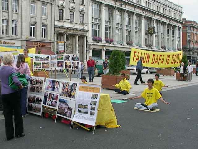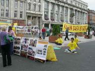 我们的图片吸引了许多人前来观看。 邮政总局也是居住在都柏林的中国人经常聚集的地方,每周在这里我们向他们发放大量的真相光碟和真相材料。我们的图片展开始后不久,一个从大陆来爱尔兰刚三天的女孩在看完我们的图片,并听学员讲真相后非常感动。她对江泽民流氓集团对善良的法轮功学员如此残酷地迫害表示出极大的愤慨,对法轮功学员们的不幸遭遇非常同情;同时,也对大法弟子们为坚持真理而不畏艰险的巨大勇气敬佩不已。她临走时真诚地对我们说:希望你们继续努力,祝你们好运!