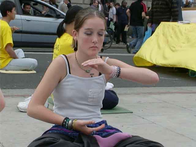 | 太阳周围的光晕 | 学员为行人教功 | 专注炼功的小女孩 |