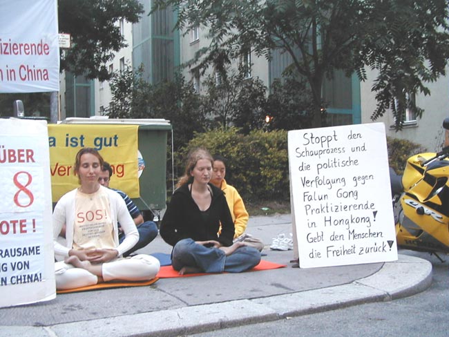8月8日晚,维也纳学员在中国驻奥使馆前举行了烛光守夜,呼吁停止在香港对法轮功学员的政治迫害。中国驻奥使馆所在的街道原本少有使馆工作人员以外的华人经过,而这一晚却有来自香港的华人经过,这一巧合使他们充分了解了在中国大陆对法轮功学员的迫害以及迫害已延伸至香港的真相。