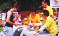 许多人来到我们的展台,索取资料,倾听我们学员的介绍,并在我们“呼吁加拿大政府出面阻止香港对法轮功学员的无理审判”的提案上签名,大半天的时间,就征集了近300多个签名。许多人主动说,我知道法轮功,我看到你们在中领馆前的近一年的24小时的静坐,我知道中国对法轮功的迫害。但是,也有很多人不明白,中国为什么要镇压这么一个和平的群体?在我们学员讲真相后,好多人明白了。