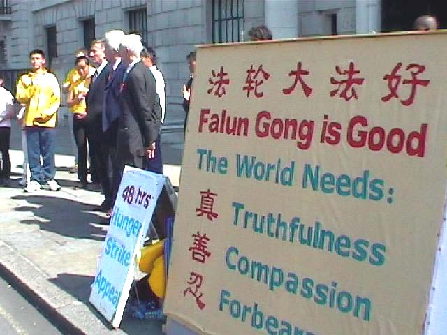【明慧网2002年8月17日】8月14日晚,英国大法学会在伦敦中使馆前召开新闻发布会,呼吁英国社会关注目前在香港发生的对以所谓“阻街罪”遭起诉的16名法轮功学员的政治。英国议会议员考顿女士、前英外交官瑟罗勋爵、莫恩勋爵、欧洲法轮功之友副主席约翰、英国法轮功学会主席彼德在新闻发布会上分别发表演讲,共同谴责港府屈从中共压力颠倒是非,提醒国际社会──江氏集团对法轮功的迫害已延伸至香港,假手香港警方扼杀及伤害本地的人权和法治。英国部分大法弟子参加了这次活动。英国BBC的两名记者跟踪采访了整个活动。