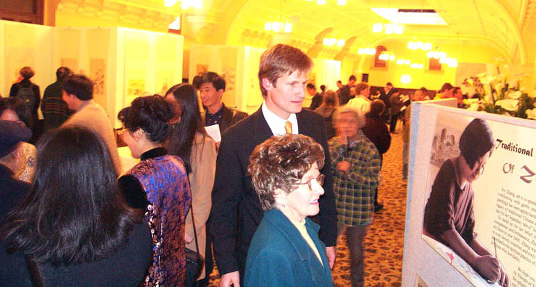 这次艺术展除了观展人数大大超出预计之外,大法学员与民众的融合程度也是前所未有的。前来看画的除了我们邀请到的市长、市议员、华人社团代表、侨界知名人士、媒体和前来义务表演的歌手外,更多的是我们不认识的人。当主持人在介绍章翠英时说到:“她拥有了一门世界性的语言,因为她有着大真、大善和面对磨难时的坚定信念和决心”时,全场观众爆发出了热烈的掌声;一位歌手临时改变了表演的曲目,并说,“我想你们忘了讲了,这次艺术展表达的一个主题便是信念。所以我将唱两首与信念有关的歌……”;特赦国际的代表除了一如既往地谴责了江泽民政府对法轮功的“系统的、由国家认可的”迫害外,也强调了在今日社会里播种“善的种子”的重要,她说特赦国际就是在当年一个人的一个善的愿望上而发展成为了今日有着百万成员的组织的;维省妇女信托基金会召集人则在发言中说,我的力量来自于以内心的和谐和善良,“要慈悲,而不要冲动。”