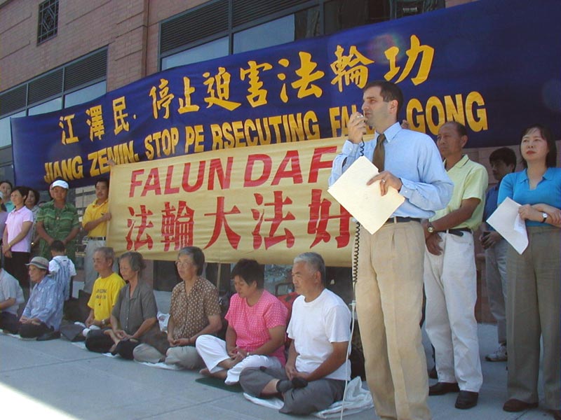 【明慧网2002年8月2日】法轮大法信息中心7月31日报导── 31日午12时15分,数十名大纽约地区的法轮功学员聚集在纽约总领馆前就香港警方检控和平请愿的法轮功学员一事举行新闻发布会,对香港能否保持其自由社会的特色从而保证其繁荣的经济文化表示深切的关注与担忧,并对香港警方不顾事实,粗暴逮捕法轮功和平请愿学员,无理检控,将在中国大陆对法轮功的迫害延伸至香港表示愤慨。