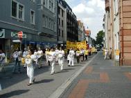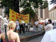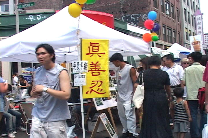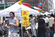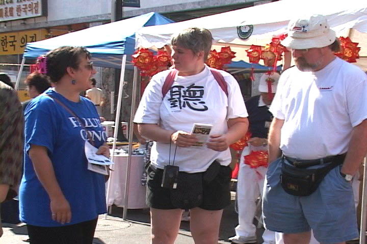 在烈日炎炎下,蒙特利尔法轮功学员召开新闻发布会,呼吁香港撤消对法轮功学员错误荒谬的审判,并揭露了江泽民对法轮功的迫害延伸到了香港。发布会后学员们举行了游行,许多市民仔细观看香港警察暴力袭击法轮功学员的真相展示图板,欣然接受真相资料。