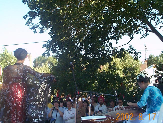野餐会是在由四家人的后院连起的一块空地里举行的,自然、轻松和随意。活动一开始,库伦先生就向大家宣布,由法轮功学员组成的光明艺术团应邀前来表演,随着“普度”悠扬的乐曲,学员们在台上翩翩起舞,这是由六位小弟子表演的舞蹈,美丽的衣裙在夏日的和风中款款而动,她们的表演如同她们手中的莲花一样纯净、祥和,众多与会者都从四周走来,脸上透着惊喜。接下来,十四岁的小弟子表演的古筝独奏,独舞“一支花”,和剑舞表演个个精彩纷呈。最后学员们表演乐舞“美丽的唐代”,表现的是一群唐代女子的生活小片断,报幕的学员告诉大家,在唐代最鼎盛的时期,举国上下都重德向善,女性在劳作之余,更要注重在琴棋书画方面的内涵修养,那样的美来自内在。学员们的精彩表演获得了阵阵热烈的掌声,很多人说,到今天才知道,原来中国历史上有这样美丽的服装,这样美好的文化。