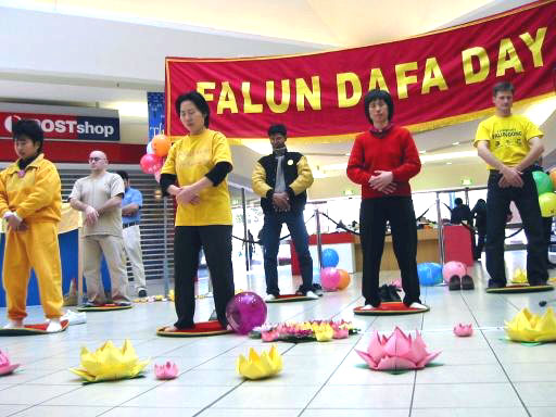 五彩缤纷的印有中英文“真善忍”字样的气球环绕活动场地四周,法轮大法洪传世界各地的图片及揭露江泽民集团邪恶迫害的图片,放置在巨幅法轮大法日横幅的两边,信息台摆满了几种语言的各种大法资料,粉黄两色的大小不等的纸折莲花点缀各处。学员们从上午10点至下午4点轮流演示五套功法,吸引了来来往往络绎不绝的人们驻足观看,尤其是带孩子的家庭。不少人还认真地和学员交谈,中英文大法资料散发得很快。