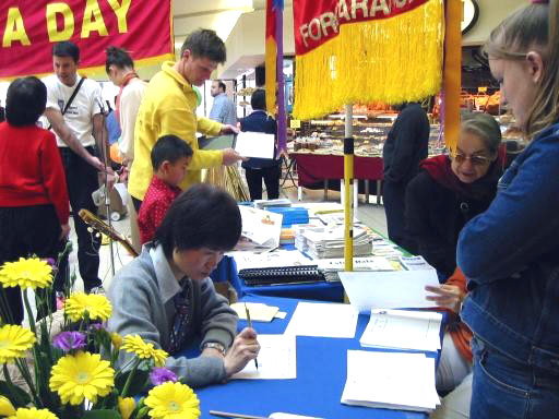 还有不少人在和学员交谈后,对法轮大法的法理、功法很感兴趣,决定开始尝试。很多人明白了在中国江泽民集团对法轮功的残酷迫害后,主动签名支持我们,对他们的善良正义之举我们表示感谢。