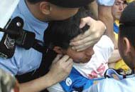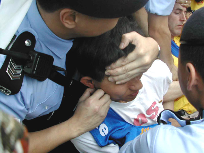 在8月2日下午首都渥太华的国会大厦内举行的新闻发布会上,法轮功学员播放了港警粗暴逮捕和平请愿的学员的现场录像。