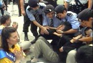 她说:港警所谓的“阻街”、“袭警”指控非常荒唐。从录像带及客观数据都很清楚地看到,请愿的法轮功学员在中联办外宽阔的人行道上,占用的空间比例很小,不妨碍任何人员或行人的出入往来,法轮功学员拿在手中的标语不可能成为阻街物品,被成伙警察围住暴力拘捕的法轮功学员更不可能袭警,香港警方在没有任何拘捕令下强行拘捕的过程,本身涉及非法行为。