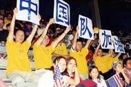 | 学员们在体育馆入口附近展示横幅和演示五套功法 | 学员们在比赛场上为中国队加油 | 学员们在比赛场上为中国队加油 |