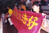 其他的学员则身着印有“法轮大法”字样的醒目的黄色T恤衫进入赛场为中国队加油,同时抓紧一切机会向周围的中国人讲真相。有的学员通过短短的交谈即消除了某些中国人被灌输的“法轮功‘自杀、杀人’”的谎言;有的学员周围的中国人都接受了传给他们的真相传单;有的学员不时地举起“法轮大法好”的牌子或横幅为每一次精彩的进球叫好。