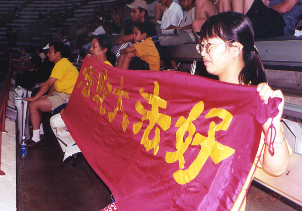 然而,大法弟子为中国队加油的权利也受到了邪恶势力的干涉。在中国队首场与德国队的比赛中,场内警察突然告诉几个打横幅的学员,组委会叫他们阻止坐在某个区域的穿黄色T恤衫的人打横幅,而这正好是这几个打横幅的学员。学员们马上找场内的工作人员询问,工作人员告诉他们横幅的内容没有任何问题。学员们遵纪守法、一切行为都符合场内的规定,会“冒犯”谁呢?难道是观众席上那几个为江氏集团卖命在海外迫害法轮功的中领馆工作人员?学员们认为自己的做法没有错。几个学员马上找组委会交涉,剩下的学员继续打出“法轮大法好”和“中国队加油”的横幅,直到比赛终场。
