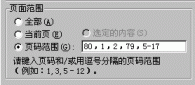 因为“页面范围”功能中各项都是单选按钮,即在同一时刻只能有一项功能起作用,可以用鼠标在不同功能间切换,哪一项前面有黑点当前就执行哪一项的功能,如上图执行的是打印全部页面的功能。下面图5执行的是按输入页码范围打印的功能,打印的是80页、1页、2页、79页、5页到第17页。