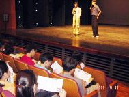 几个社团介绍之后,随着“普度”的音乐一放,本来浮躁的气氛安静了下来。拿到简介的学生无不仔细的阅读。在台下,学生们专注的聆听我们诉说什么是法轮功,人为什么要修炼,以及发生在大陆的迫害真相。有人一看到我们的学员马上就说:果然是法轮功的样子。有人说:真的祛病健身这么神奇?我妈妈应该也要炼一炼。有人说:那大陆怎么会这样!太不分青红皂白了。有人看到资料中泽农的修炼故事,特别感动的说:这真的是教人做好人的。