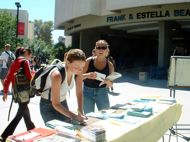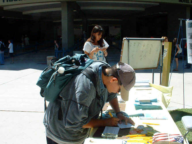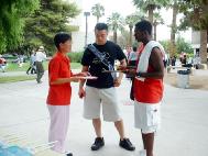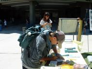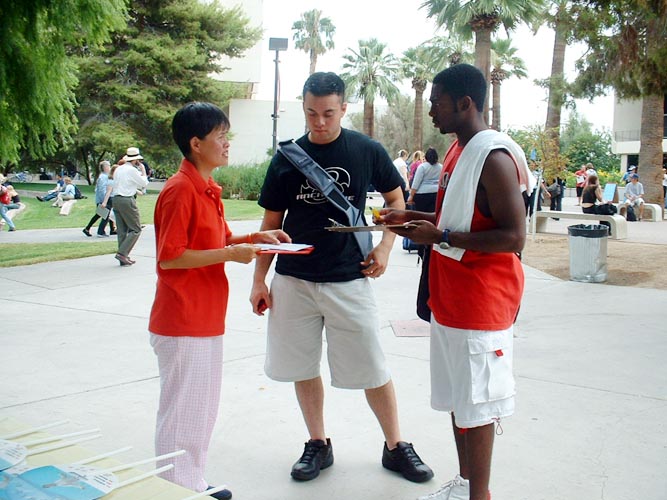 九月九日,大法学员们来到内华达大学,正在摆放图片展板,就开始有人围过来了。一位年轻的姑娘饶有兴趣地问了很多气功的问题;她问:法轮功跟其它气功有何区别?当学员告诉她法轮功是一种古老的高层次的修炼方法,他的特点是“法炼人”“性命双修”时,她说:这么好的功法,我一定要告诉我父亲,他是印尼的气功师,然后签了名,拿了资料才离去。