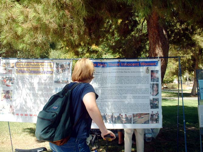 一位善良的女学生在展板前观看良久,她一边看一边擦着眼泪说:天啊!他们连婴儿都不放过,太残忍了!有不少人看完图片后与我们学员交流,有的说,看完你们的图片,我很难过,一个国家如此虐待它的民众,令人难以接受,还有的说,我希望你们坚持,直到胜利。
