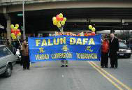 英文“法轮大法”、中文“真善忍”、西班牙文“真善忍”三种文字一体的蓝底金字的大横幅由黑人、白人、黄种人三位大法学员举着在前面开道。接下来又是大大的黄底红字横幅,英文“法轮大法”和中文“法轮大法好”,学员们带着醒目的嵌有色彩明亮的黄围巾、手执鲜艳的气球走在游行队伍中。白底蓝字的英文和西班牙文的“真善忍”大横幅最后。大法音乐悠扬。