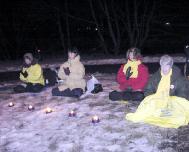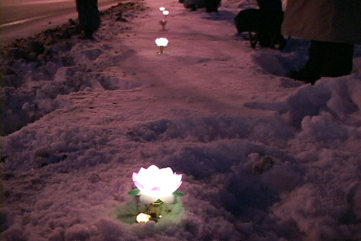 集体发正念之后,学员用中英文朗读了声明。夜幕降临了,一盏盏小小的莲花灯,在白雪的映衬下,显得格外圣洁、纯净。