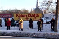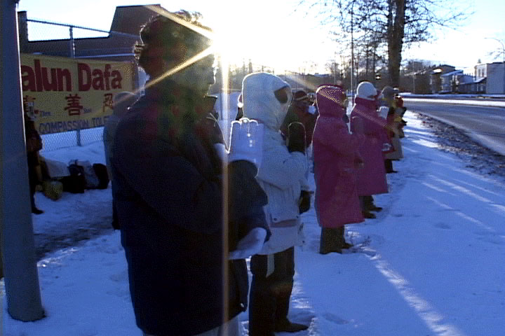 【明慧网2003年1月14日】2003年1月12日下午2:00至晚6:45,渥太华、蒙特利尔两地的法轮功学员顶着凛冽的寒风,在近零下二十度的严寒天气里,开始了为期三天的请愿和烛光守夜活动,揭露江氏政治流氓集团对法轮功的严酷迫害,要求立刻停止对法轮功学员的虐杀。
