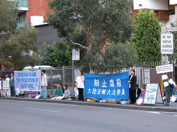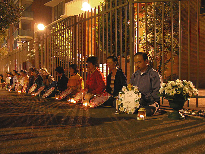 【明慧网2003年1月14日】针对近日在中国的法轮功学员被迫害致死的人数大幅度增加,悉尼法轮功学员在星期一(1月12日)晚在中国使馆前举行了烛光悼念,强烈要求停止虐杀。