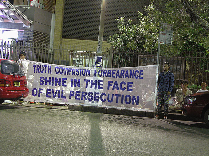 2003年1月12日晚1点左右,奥克兰的同修们陆陆续续地来到中国驻奥克兰总领馆,抗议中国江氏集团对法轮功学员施行“群体灭绝”。