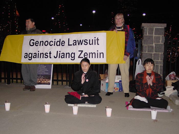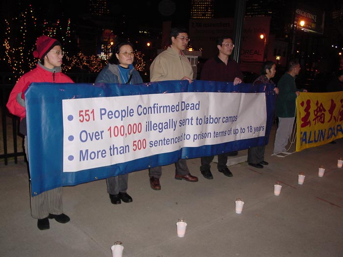 参加烛光悼念的人士中,有老人和小孩,以及曾在中国亲身遭受迫害的法轮功学员。现年33岁的吕先生,1995年在乔治亚州立大学攻读财经学位,后因不幸患上乙肝病,不得不中途辍学,修炼法轮功后,身体奇迹般地得到恢复。回国后,吕先生曾在深圳市国家税务局担任稽查科副科长。2000年,在中国当局镇压法轮功的压力下,吕先生被迫辞职,2000年11月,吕先生的新婚两个月的妻子周雪菲因在街头向公众澄清法轮功真相,被当局逮捕,非法判处三年劳教监禁。吕先生说:“我的妻子周雪菲被关押已有一年多了。在中国象我妻子这样的被迫害的人有千千万万,我们希望全世界的人来帮助这些无辜善良的民众。芝加哥联邦法院已受理了起诉江XX的案件,以‘灭绝种族罪’起诉江XX正是反映了我们千千万万炼法轮功人的心愿。”