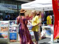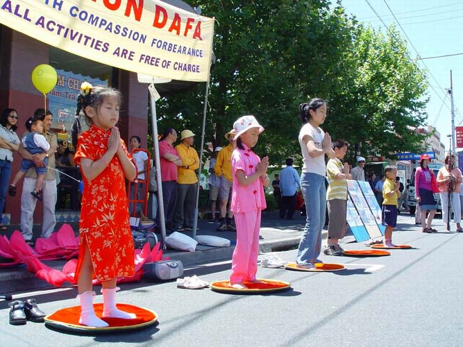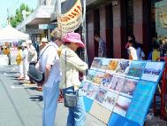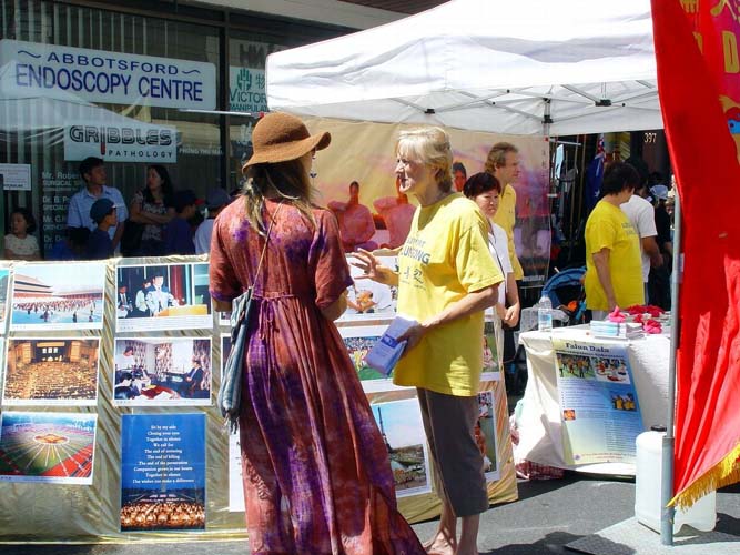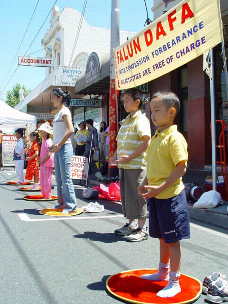 在人山人海的摊位前,墨尔本大法弟子们送出了大量的资料和光盘,有些经过的中国人惊奇地指着我们的摊位说:“快看,法轮功啊!”,也有很多中国人主动前来索取资料。明慧学校小弟子们的功法演示特别引起小观众的兴趣。当地的媒体也前来采访了大法弟子。