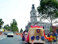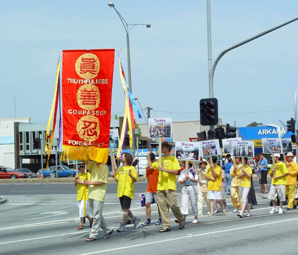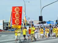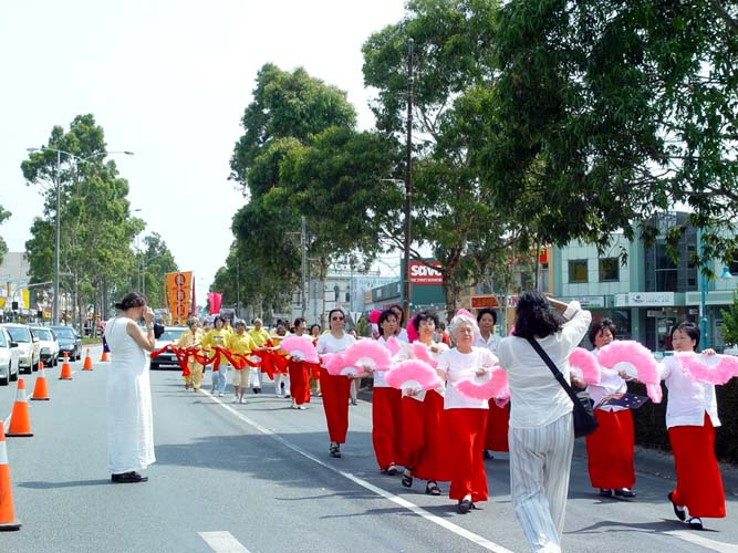 在由20多个不同团体组成的游行队伍中,大法弟子的队伍格外引人注目。为了这次游行,弟子们特意排练了扇子舞、红绸舞。在莲花车、扇子舞和红绸舞表演队后面,还有一队学员手里举着写有不同国家名称的标牌,向人们展示着大法在全世界的洪传。当大法弟子的队伍经过时,围观的市民们报以热烈的掌声。